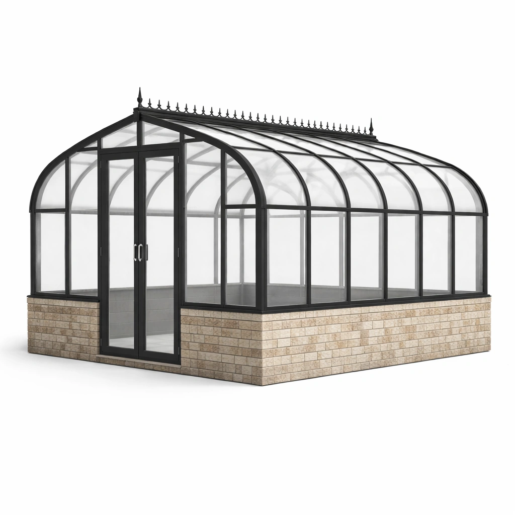 Material: Aluminiumrahmen, klare Polycarbonatplatten, Ziegelbasis