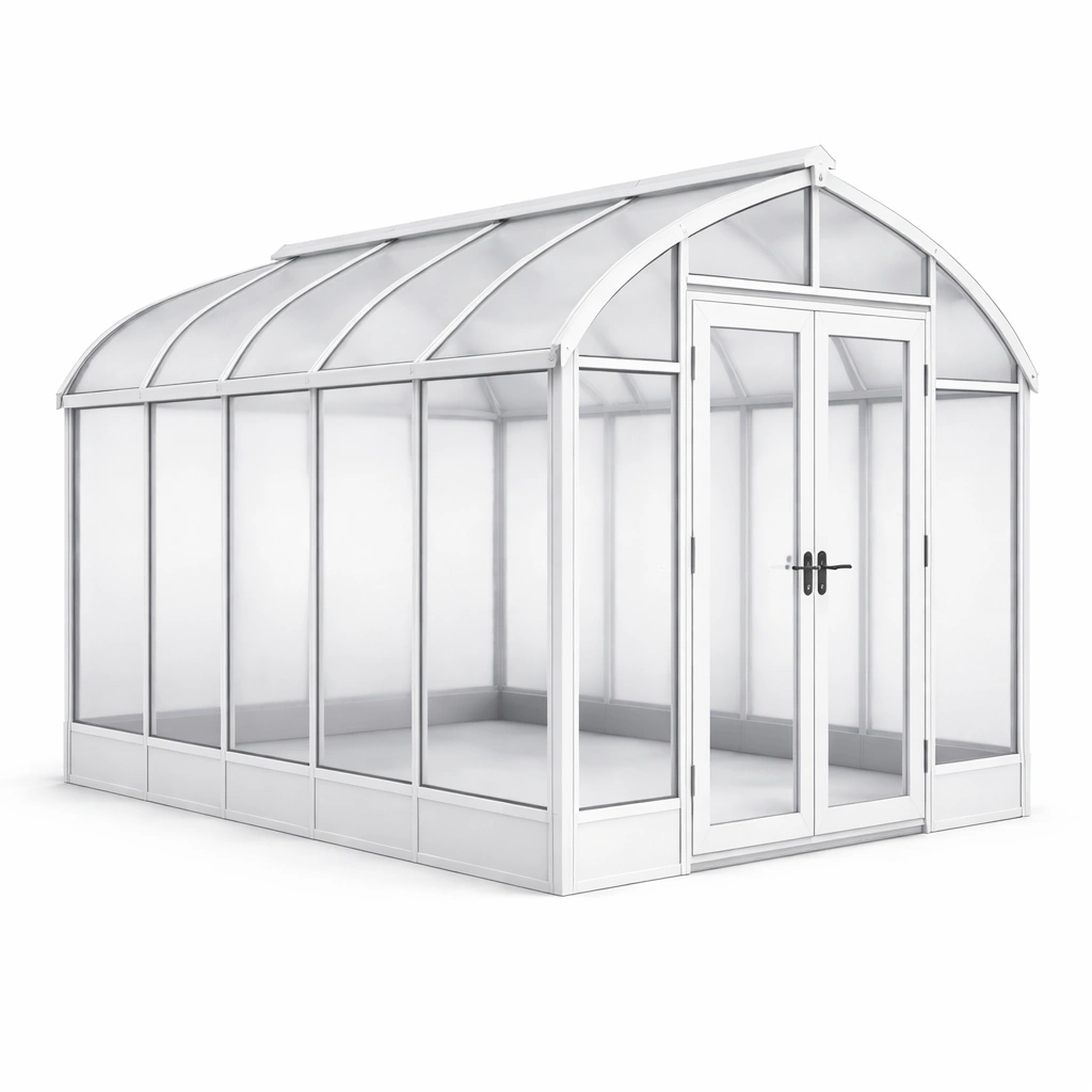 Das Gewächshaus besteht aus 6 mm starkem Polycarbonat und einem stabilen Aluminiumrahmen. Es verfügt über eine Doppeltür und ein Belüftungssystem für optimale Luftzirkulation. Die Konstruktion eignet sich für den Außenbereich.