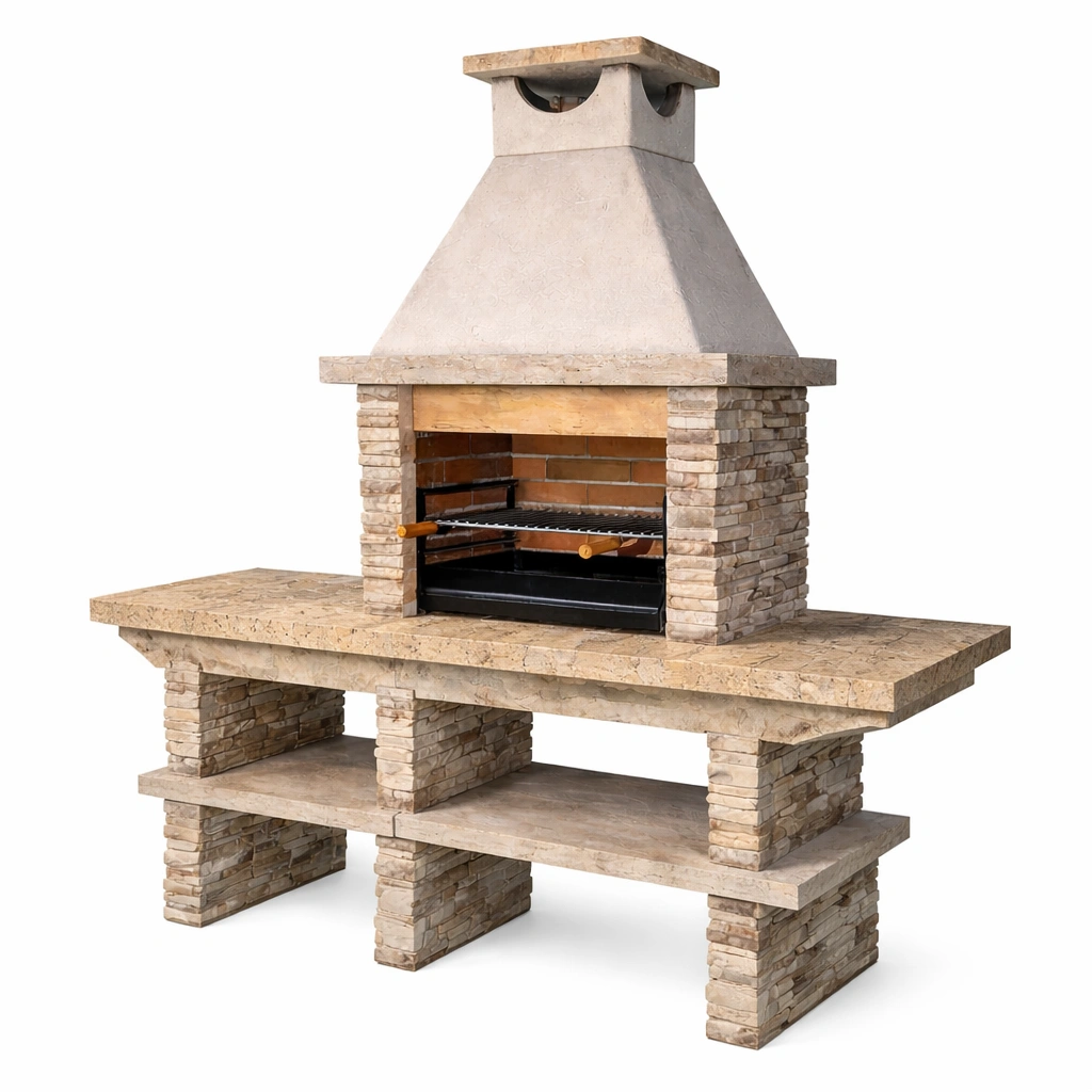 Dieses Steingrillkamin besteht aus stabilem Beton mit einem Innenraum aus Ziegeln.